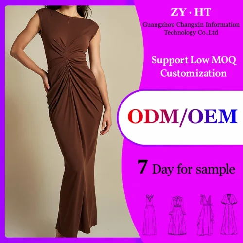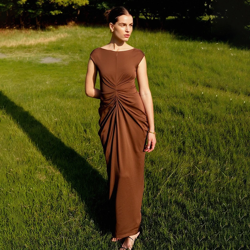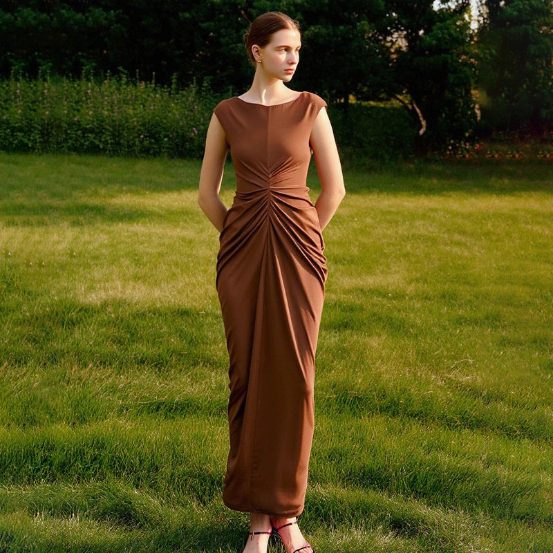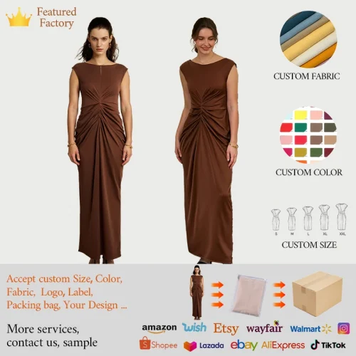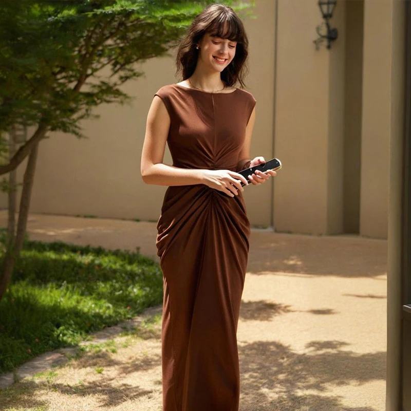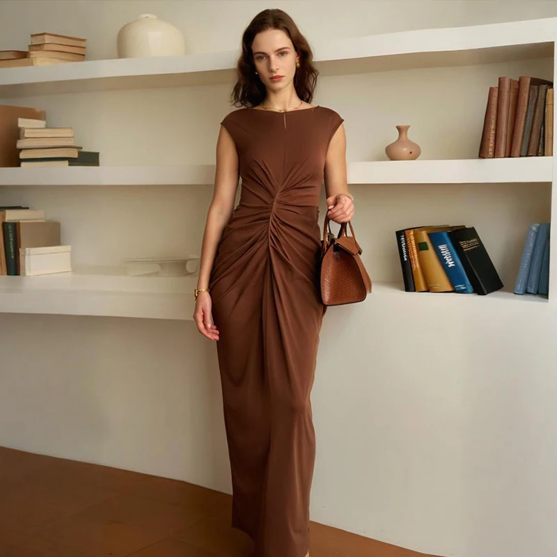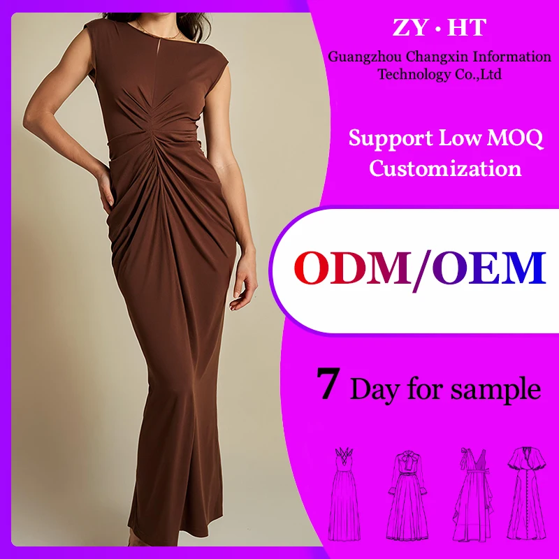 ZYHT 73006 Women’s Clothing Fashion Sleeveless Ruched Maxi Dress Elegant Casual Dress Long Dress for Ladies