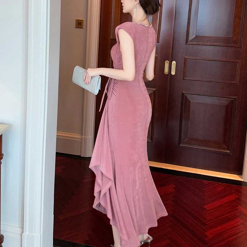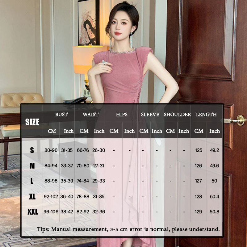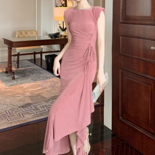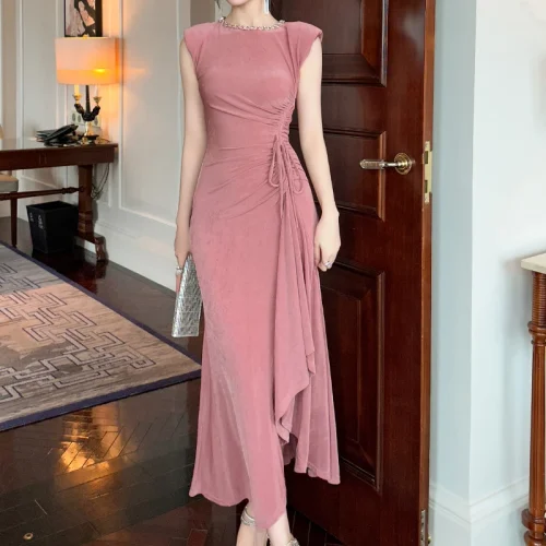 ZYHT 80156 Women Long Dresses With Drawstring Shoulder Pad Crew Neck Ladies Dress Party Club Bodycon Maxi Dress