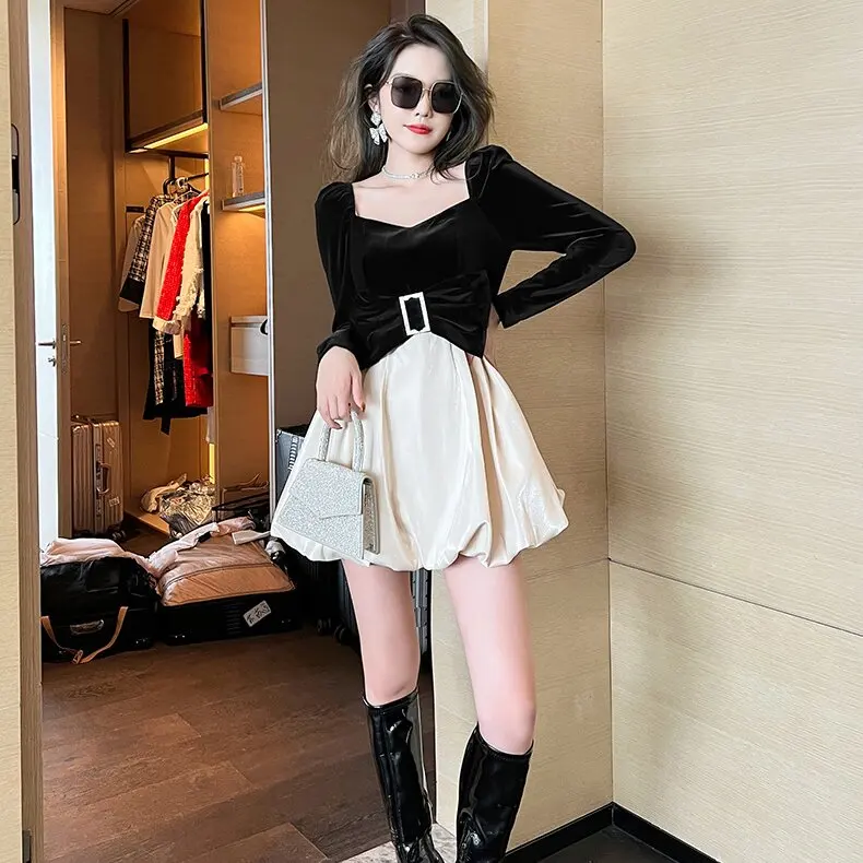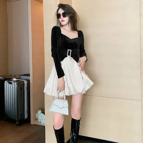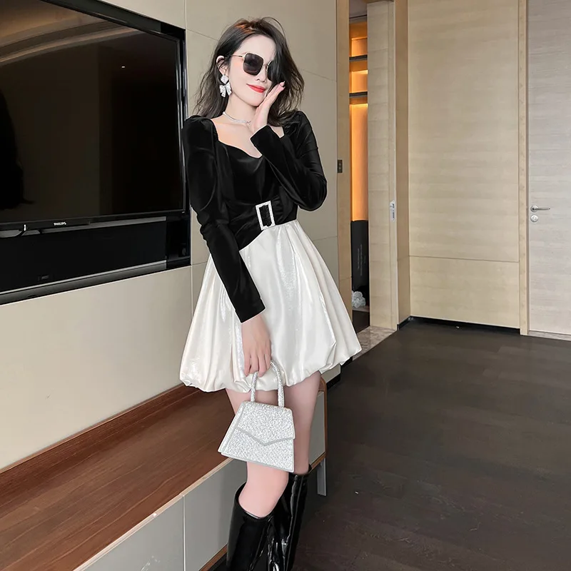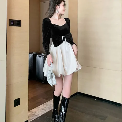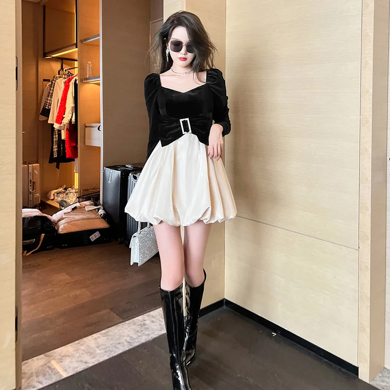 Product Name: ZYHT 9418 2024 a Line Puffy Elegant Birthday Party Sexy Mini Short Velvet Fabric Long Sleeve Dresses for Women