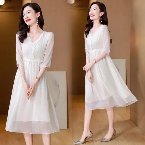 Luxurious Summer Silk Dress for Women Casual Lace Solid Color Adjustable Waist Chic Chiffon Dress for Ladies