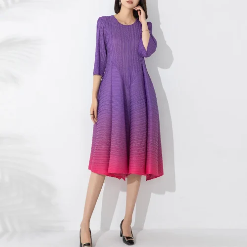 Middle Eastern Women’s Stylish Pleated Plus Size Dress – Casual Gradient Color Loose Fit Round Neck Bud Design