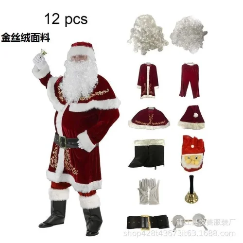 Men Deluxe Santa Costume Suit for Adults 10pcs Santa Claus Costumes for Christmas Xmas Velvet Red