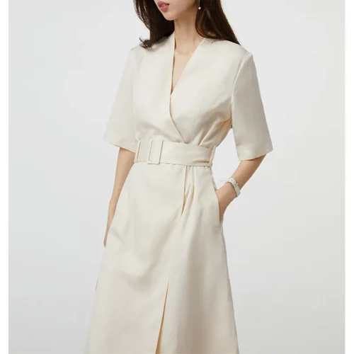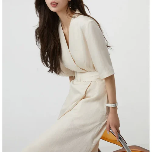 New Design Women Ladies Summer Casual V Neck Half Sleeve Midi Loose Elegant Cotton Linen Dress Women
