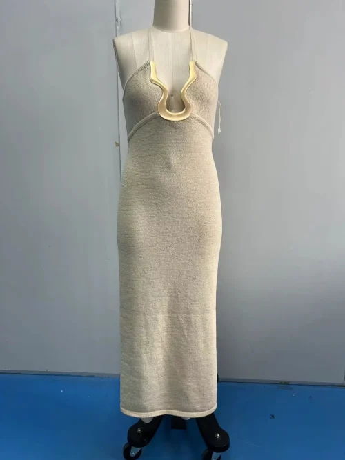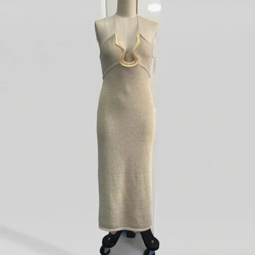 New Design Lady Casual Evening Dress 100% Tape Yarn Knitted Long Dress With Gold on Chest