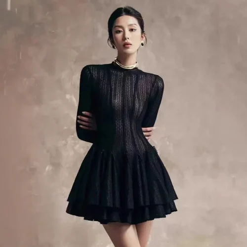 New Fashionable Round Neck Slimming Dress Women Casual Mini Pleated Elegant Lace Dress With Long Sleeves and Layered Ruffle