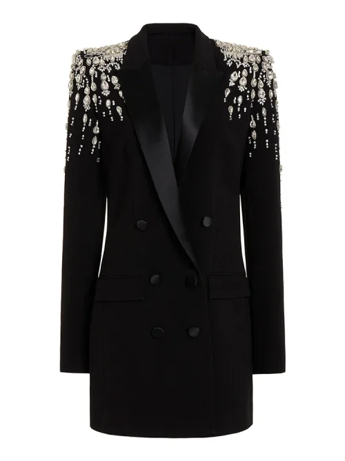 New Fashionable Ladies Black Beaded Diamond Long Sleeves Business Suit Dresses Casual Blazer Coat