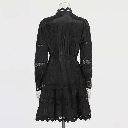 New Stand Collar Embroidery Tie Ruffle Lantern Sleeve Pleated Dresses Lace Dress for Women