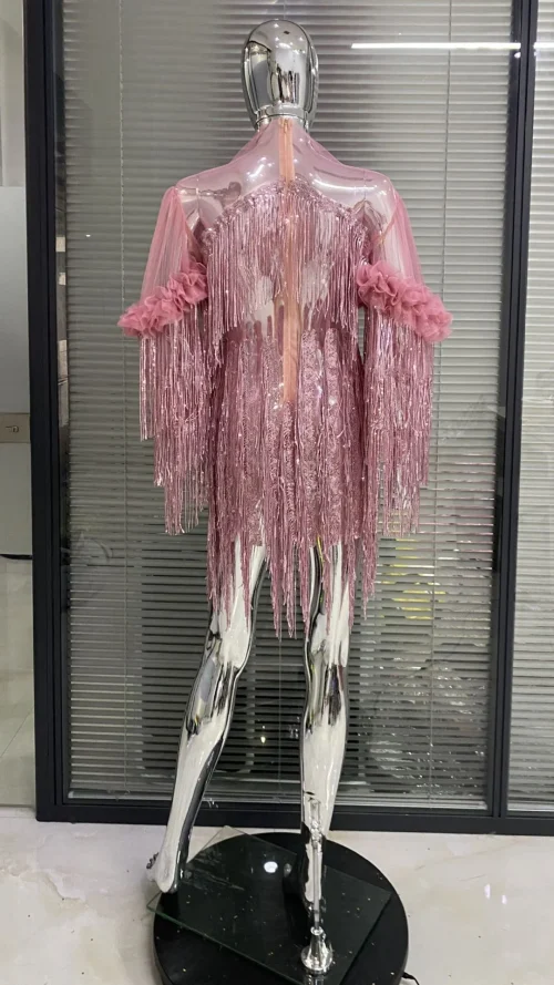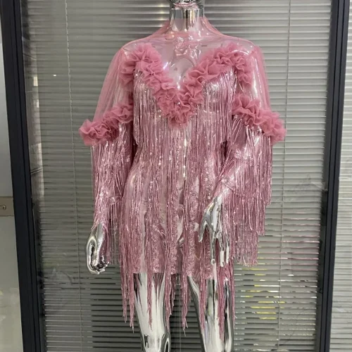 OUDINA New Arrival Mesh Tassel Dress Fashion Sequin Short Dress Evening Party Dresses Women