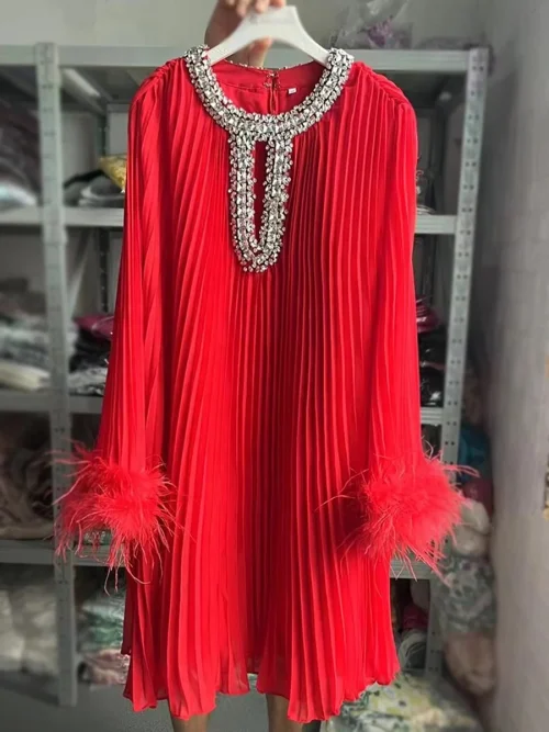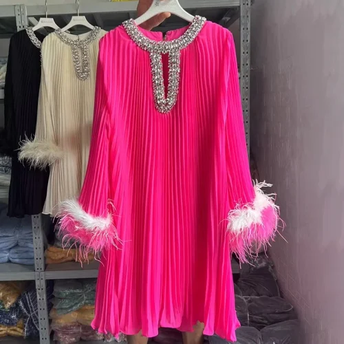 OUDINA Fashion Feather Diamond Rhinestones Casual Long Sleeve Loose Pleated Casual Dresses Lady Elegant Dress for Women