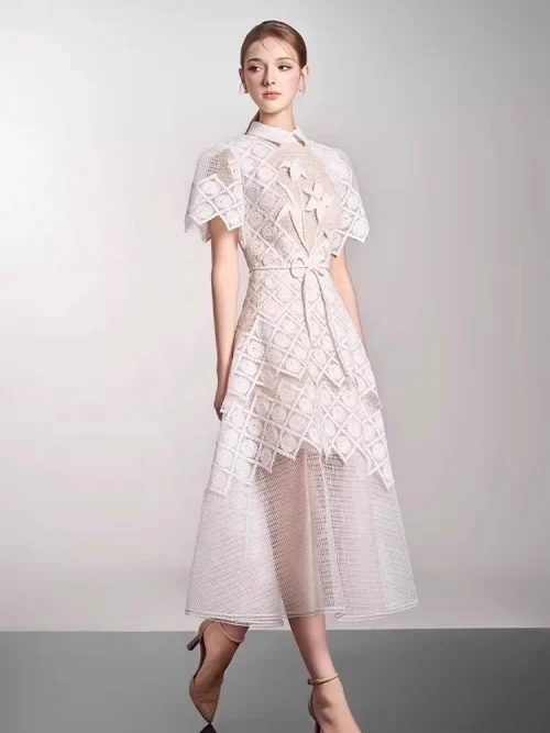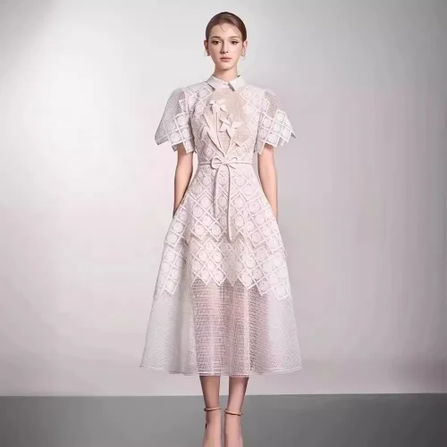 OUDINA New Arrivals Casual Lapel Three-Dimensional Flower Diamond Mesh Long Party Dress Women Elegant Dresses