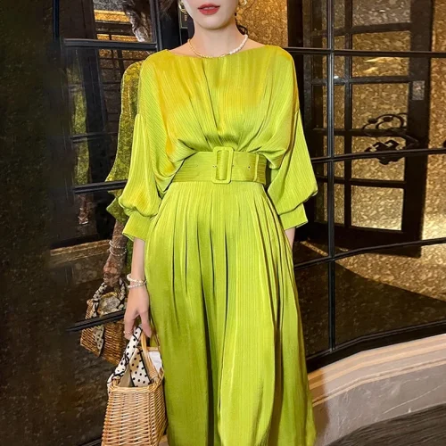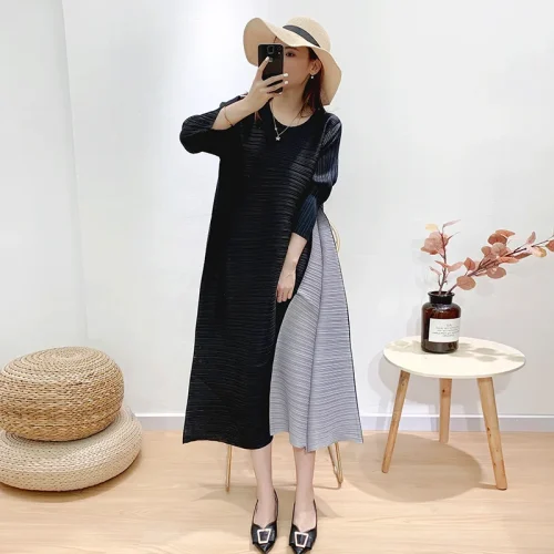 Oversize Casual Dress with O-Neck Patchwork Color Blocking Versatile Dresses Pleated Elegant Dresses