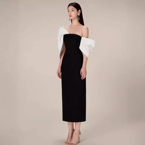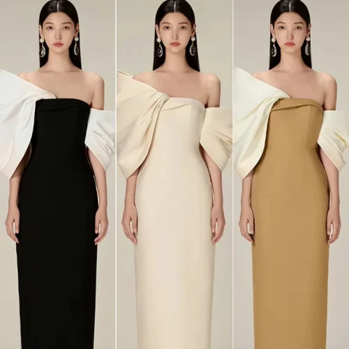 Stylish High-Waisted Women’s Dress Elegant Tube Top with Off-Shoulder Bow Fashion Boutique’s Woven Solid Pattern Dress