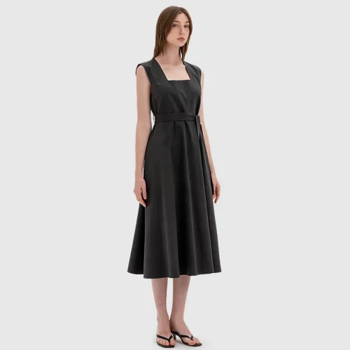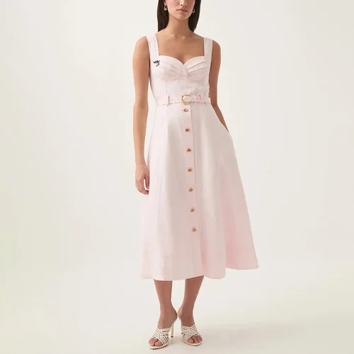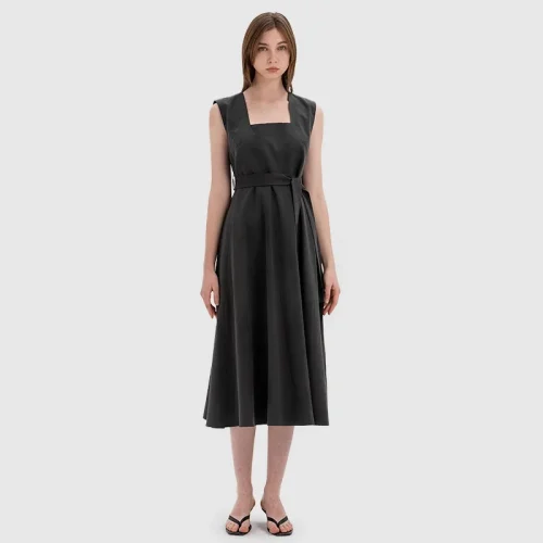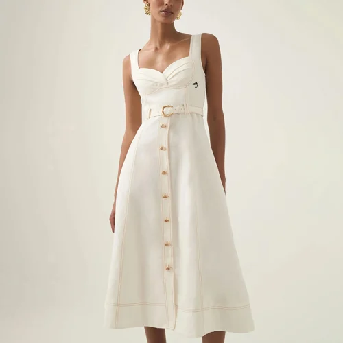 Summer Vintage Style Elegant Korean Square Collar A-Line Sleeveless Belt Casual Dress for Women