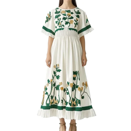 Summer Women New Style Flower Embroidery Dress Ladies Round Neck Half Sleeve Casual Midi Dress