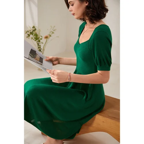 Summer Women’s Fashionable Solid Pattern Short-Sleeve Green Belted Dress