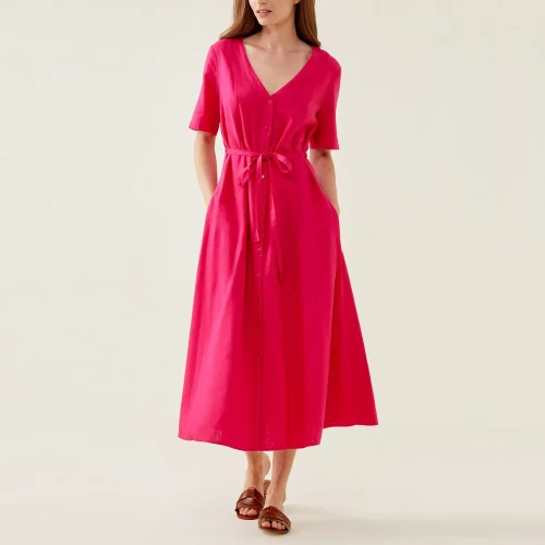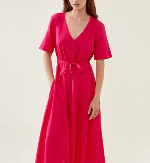 Summer Women’s Dresses up Women’s Medium Long Linen Dress V-neck Short Sleeve Blend Casual Front Button Waist Lace ODM