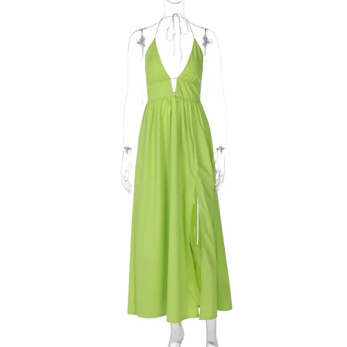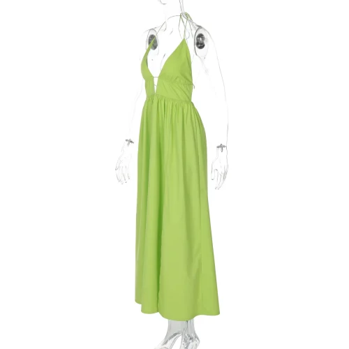 Summer Vacation Style Dress with a Sexy Deep V Neckline Open Back Design Solid Color a Draped Neck Length.