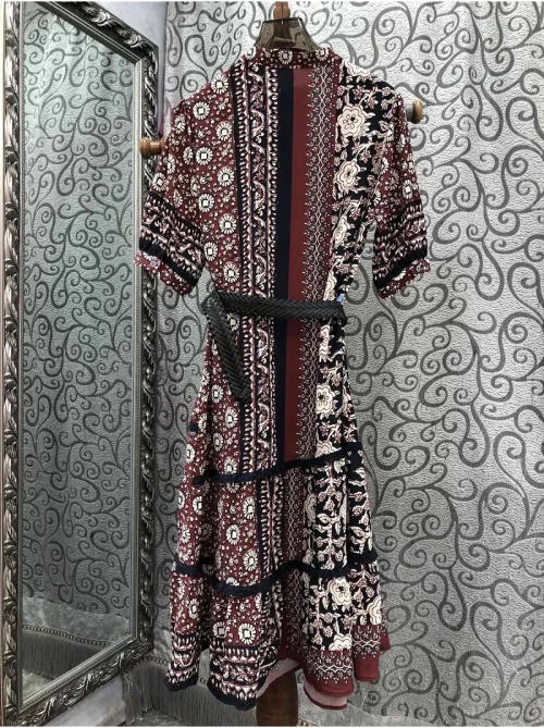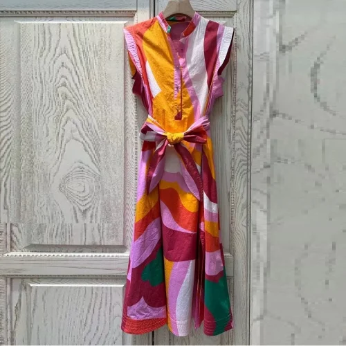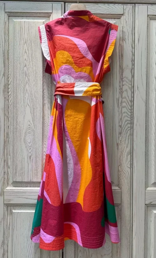 Top Quality Women’s Dress 2023 Summer Style Ladies Colorful Prints Pocket Belt Patchwork Sleeveless Mid-Calf Length Casual Dress