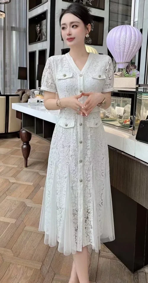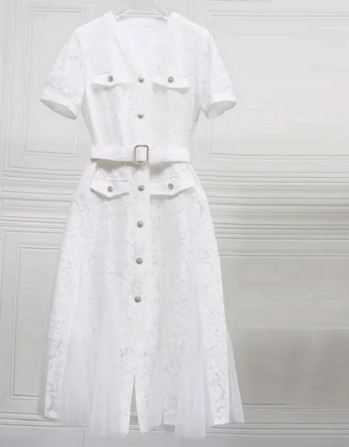 Top Quality Lace Dress 2024 Summer Fashion Style Women V-Neck Sexy Tulle Mesh Patchwork Mid-Calf White Blue Lace Elegant Dress