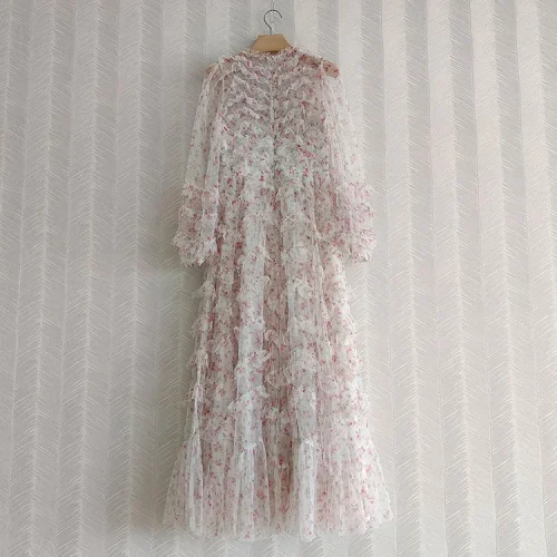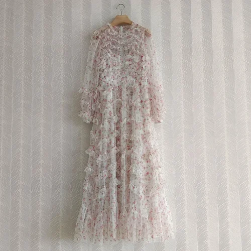 Top Quality New 2021 Autumn Long Party Wedding Women O-Neck Allover Cascading Ruffle Flower Long Sleeve Maxi Gown Dress Festival