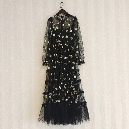Top Quality New Long Dress 2022 Spring Party Evening Women Sexy Tulle Mesh Embroidery Long Sleeve Black White Long Maxi Dress