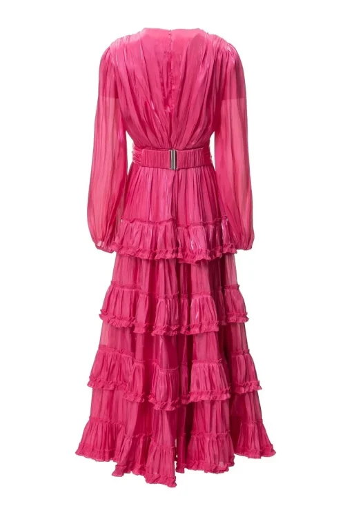 Top Quality New Long Dress 2024 Spring Summer Party Special Occasion Women Ring Belt Deco Cascading Ruffle Long Maxi Dress Pink