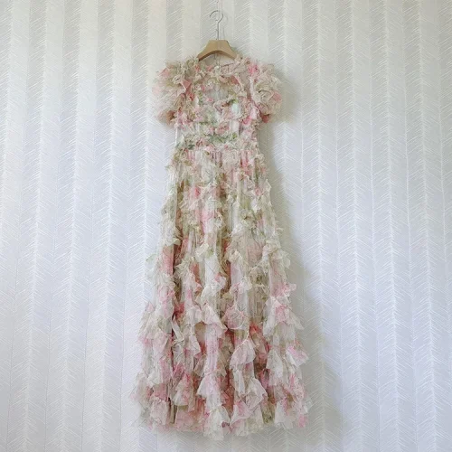 Top Quality New 2022 Spring Long Party Wedding Women Cascading Ruffle Mesh Flower Patterns Elegant Red Apricot Pink Gown Dress
