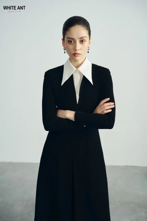 WHITE ANT Manufacturer ANDREA MIDI DRESS 100% Polyester Casual Dresses High Quality Long Black Flared Dress With Collar