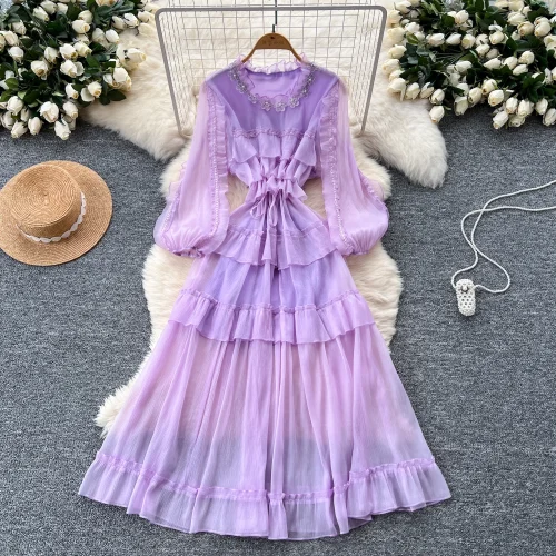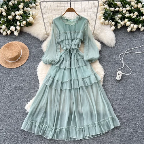 Vintage Dress LW1437 Beaded Round Neck Puff Sleeve Tie-Waist Dress Women’S Ruffle Hem A-Line Elegant Dresses for Women
