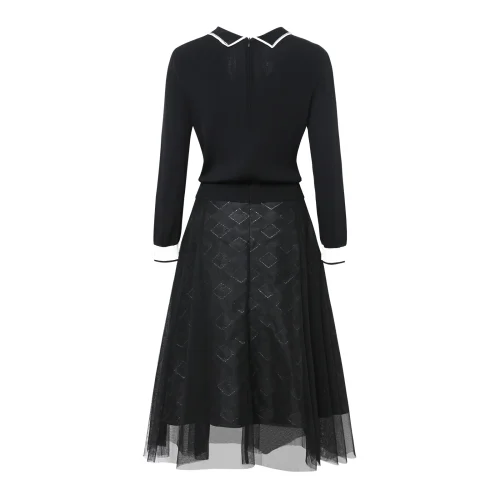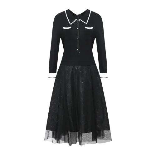 2024 New Arrival Autumn Winter Black Turn-Down Collar Knitted Stitching Mesh Pleated Slim Formal Dresses for Women