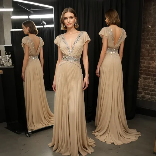 ZYHT 73043 Women Formal Dinner Gown with Sparkling Embellishments Backless Design Glamorous Bridesmaids Evening Dress for Ladies
