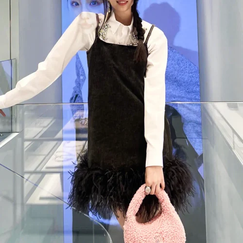 Fashion Sleeveless Ostrich Fur Dress Ladies Casual Sundress Party Denim Dress Women