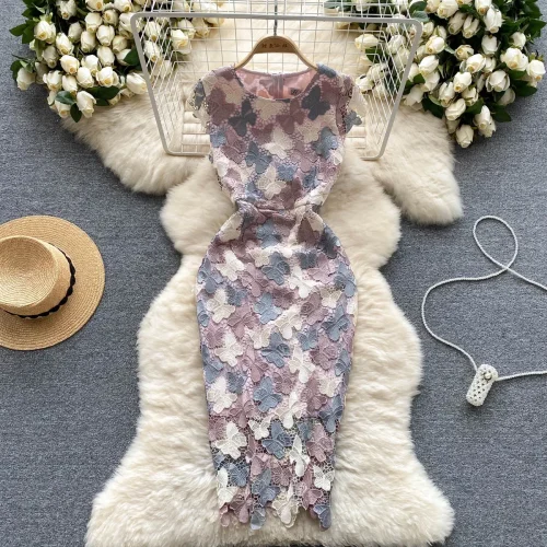 QFZ104 -Sleeveless Dress Pencil Women Clothing Woven Simple 2024 Sexy Embossed Summer Polyester for Women Clothing