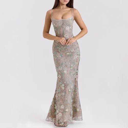 Silver Beaded Corset Maxi Dress Women Elegant Embellished Evening Gown Formal Wear Party Dress