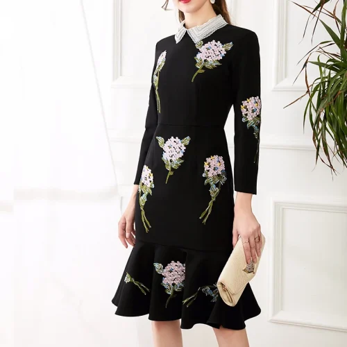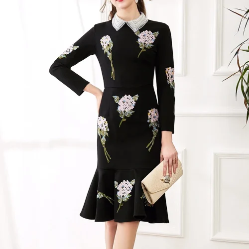 Women’s Heavy Embroidery Long Sleeve Fishtail Slim-Fit Dress European Station Floral Pattern Extra Size Available