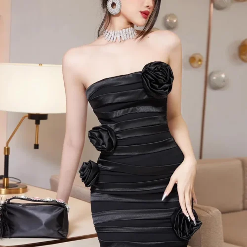 Dropshipping New Fashion Black Flower Decoration Pleated Slim-fit Wrap Buttock Sleeveless Gown Dress Long Women