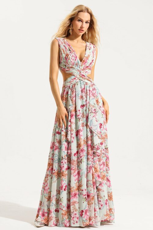 Flora V-neck Pleated Cutout Ruffle Hem Maxi Dress