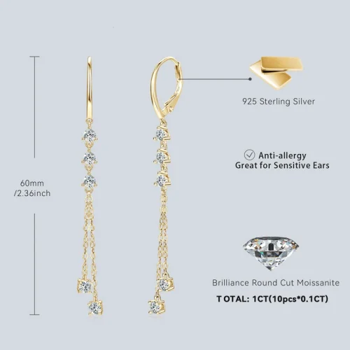 Women’s Chain Earrings 925 Sterling Silver 1.00CTTW Round Moissanite Drop Earrings for Women