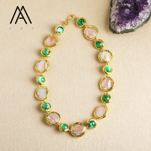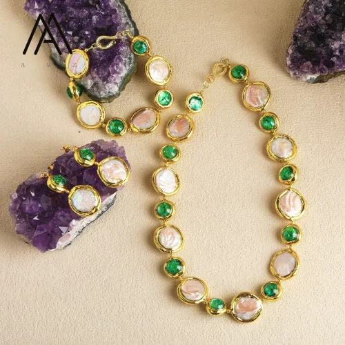 Women’s Fashion Jewelry Set Freshwater Pearl & Green Glass Beads Gold-Plated Necklace Earrings & Bracelet for Wedding & Parties