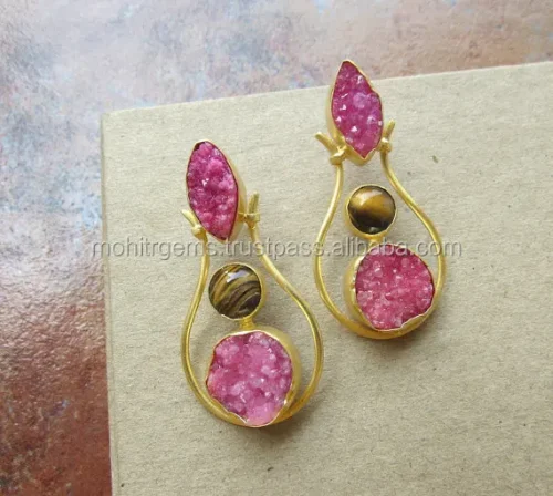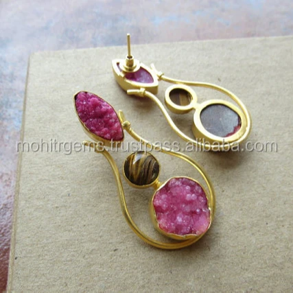 Women’s Stainless Steel Earrings Gold Plated Sugar Agate Tiger Eye Cabochon with Pearls & Diamonds Trendy Jewelry for Party Gift