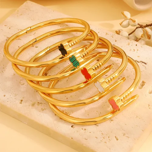 Women’s Stainless Steel Bracelet with Four Leaf Clover Nail Non-Fading Fashion Accessories Simple Style Beaded Bangle