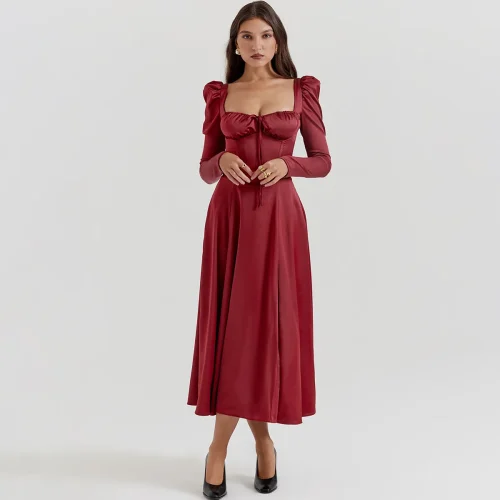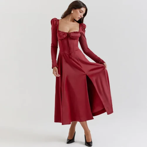 High Quality Elegant Ruched Puff Sleeve Spaghetti Strap Bustier French Dress Vintage Long Sleeve Backless Split Dress