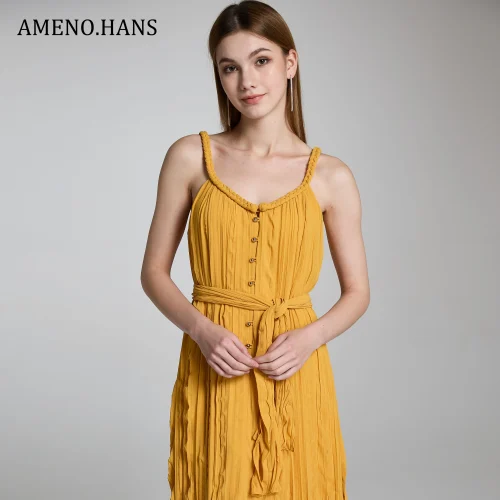 High Quality Ladies Pleated Casual Summer Solid Color Sashes Sundress Beach Maxi Dresses