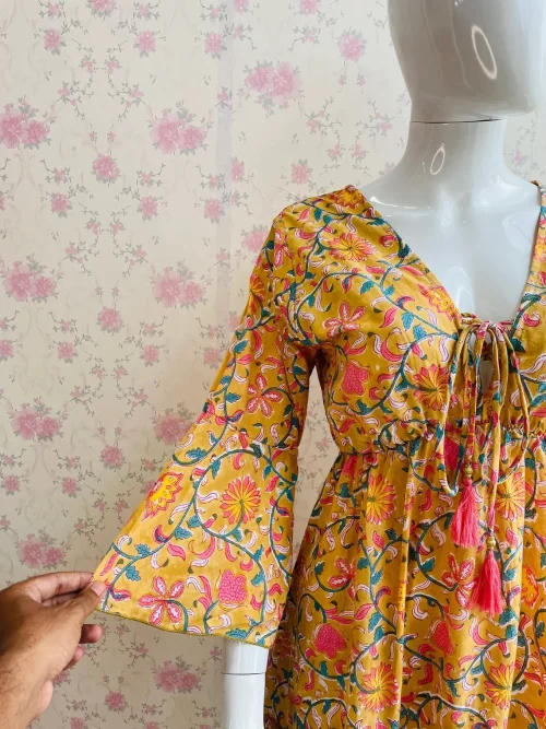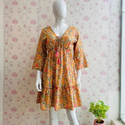 High Quality Cotton V-Neck Party Dress for Women Short Block Print Breathable and Patchwork Design for Autumn Season