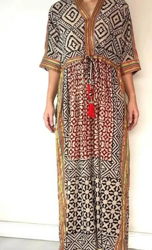 Jaipur Hand Block Print Long Kaftan Dress Zari Border Cotton Maxi Gown Dress V-Neck Sundress for Her Halloween Gift Beach Dress