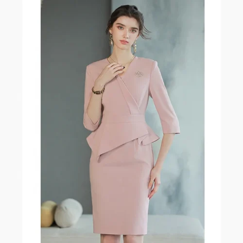 Korean Style Chinese Office Wear pink Elegant Graduation Dresses Lady Office Bank Company Wear Dress