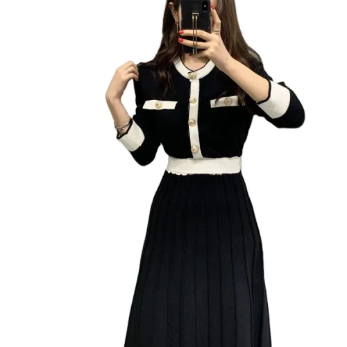 Knitwear Manufacturers Elegant Women’s Knit Slim a Line High Waist Pleated Dress Women Soft Ladies Long Sweater Dress