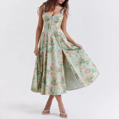 Light Bustier Sundress Casual Dresses Print Jade With Puff Sleeves and Thigh Slit Women Summer Natural Service Woven Adults