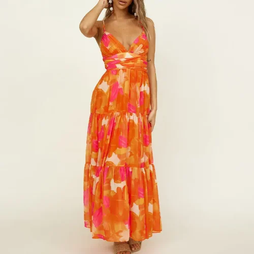 Ladies Bohemian Fashion Sexy Elegant Beach Chiffon Floral Long Dress Summer Boho Casual Maxi Boob Slip Dress for Women