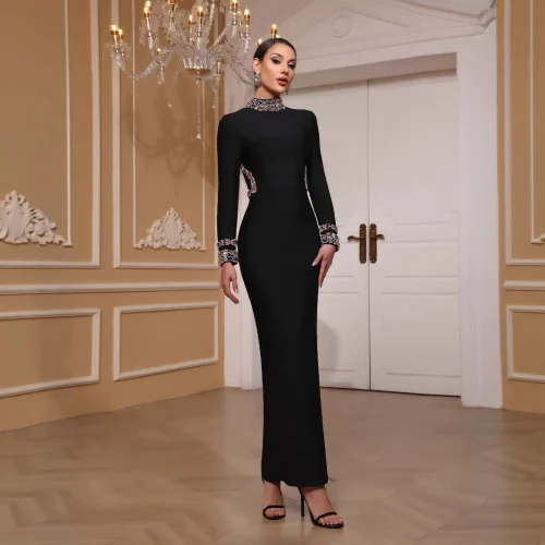 Luxury Black Bandage Beaded Midi Diamond Sequin Decoration Gala Dinner Dresses Gowns Women Elegant